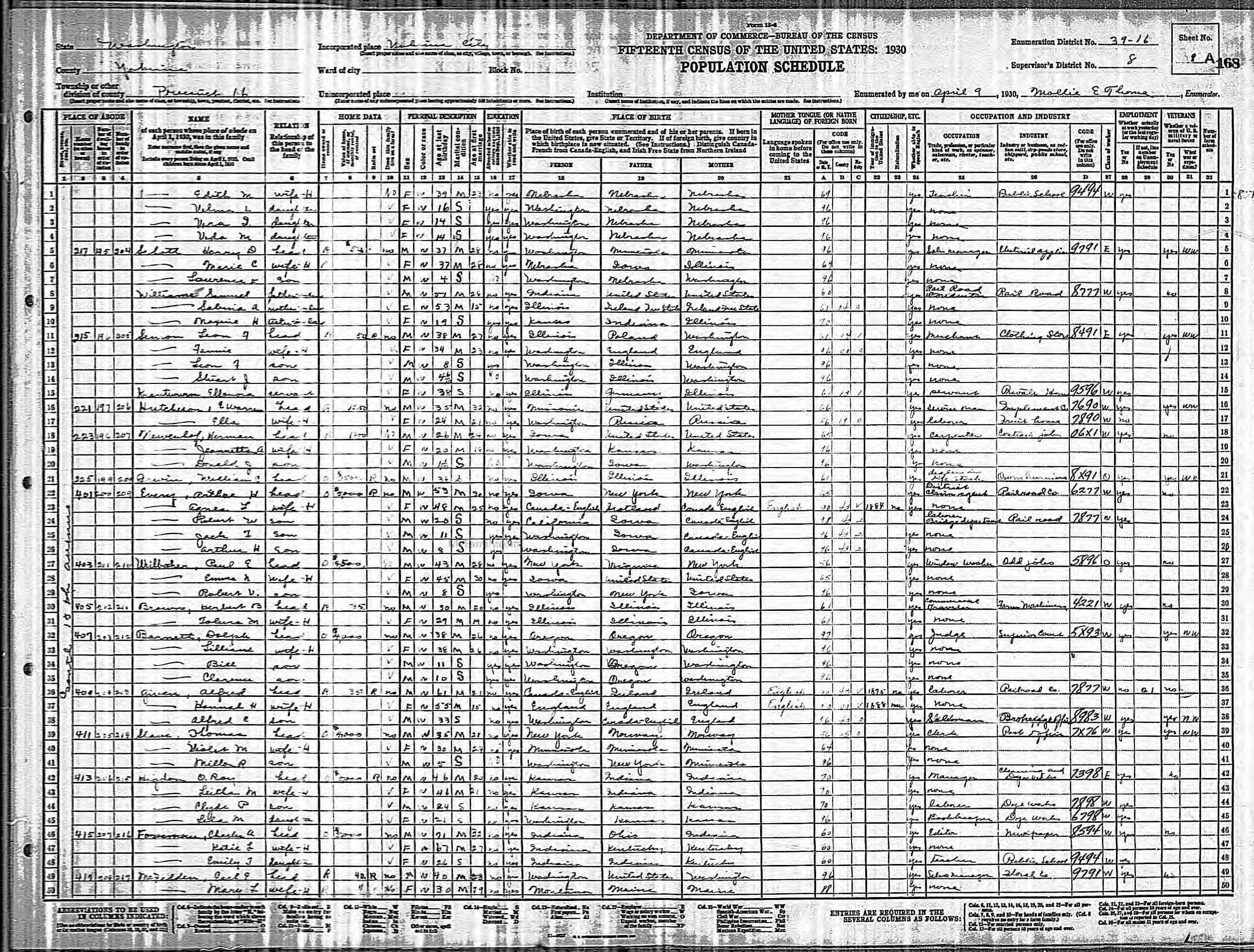 | Line | Family | Name | Relation | Sex | Color | Age | Status | Self | Father | Mother | Occupation | XR | XW |