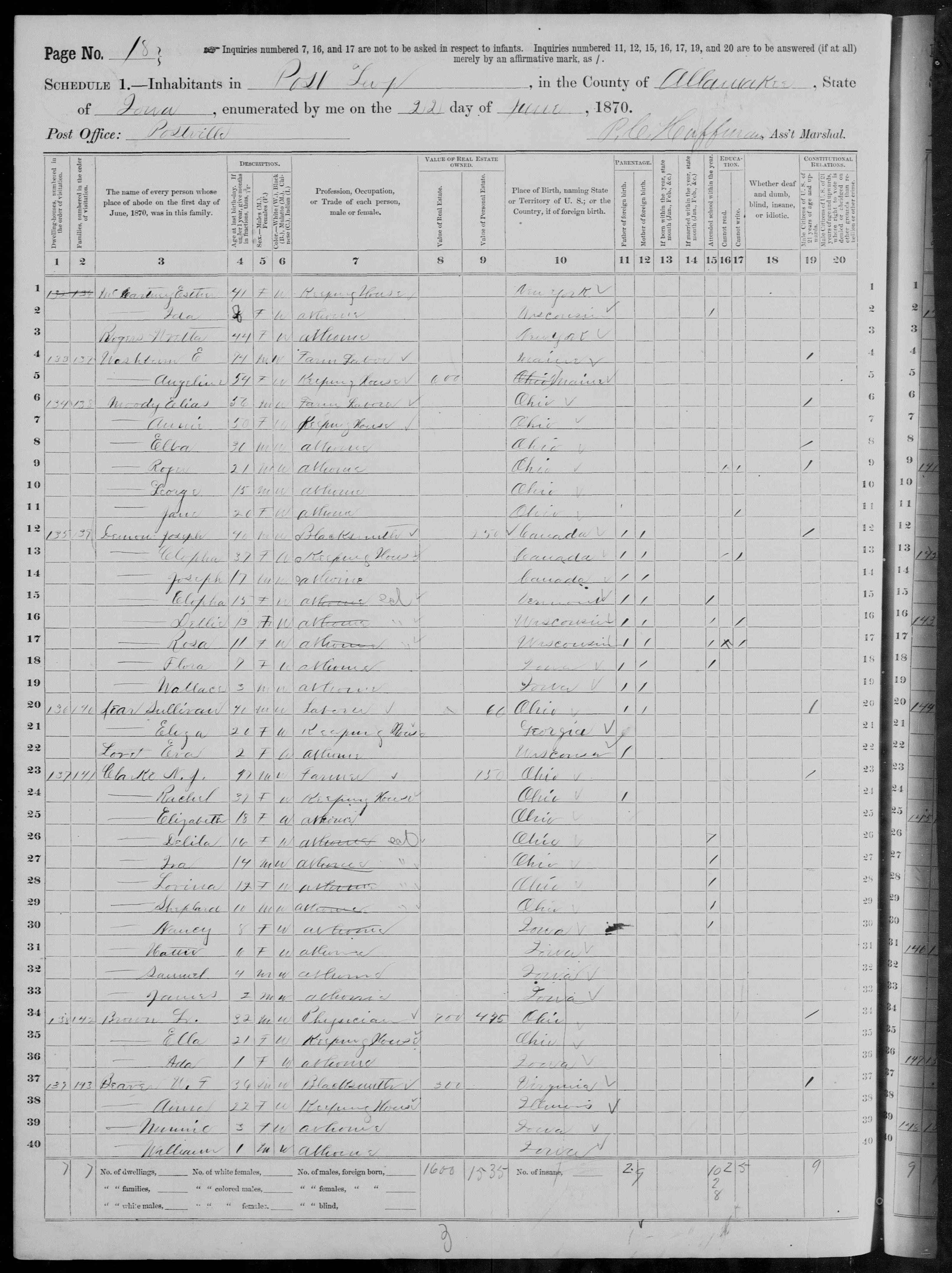 | Line | Family | Name | Age | Sex | Color | Occupation | Home Value | Personal Value | Birthplace | Father Foreign | Mother Foreign | XR | XW | B | D | I |