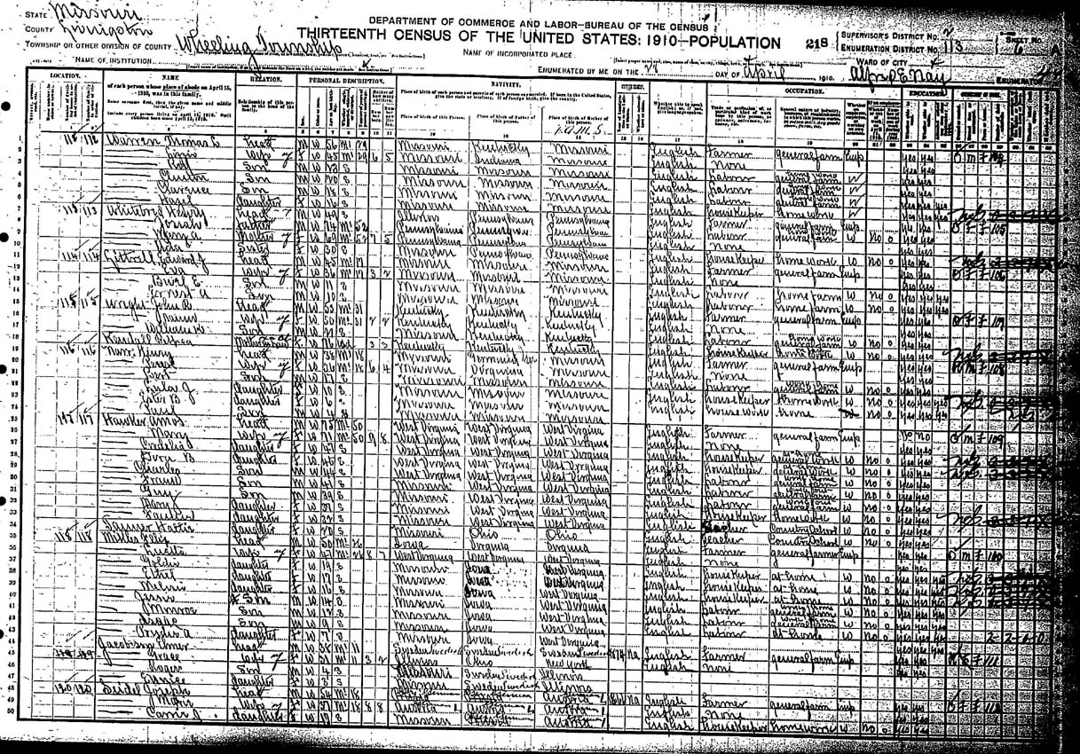 | Line | Family | Name | Relation | Sex | Color | Age | Status | Years | Total | Living | Self | Father | Mother | Occupation | XR | XW | B | D |