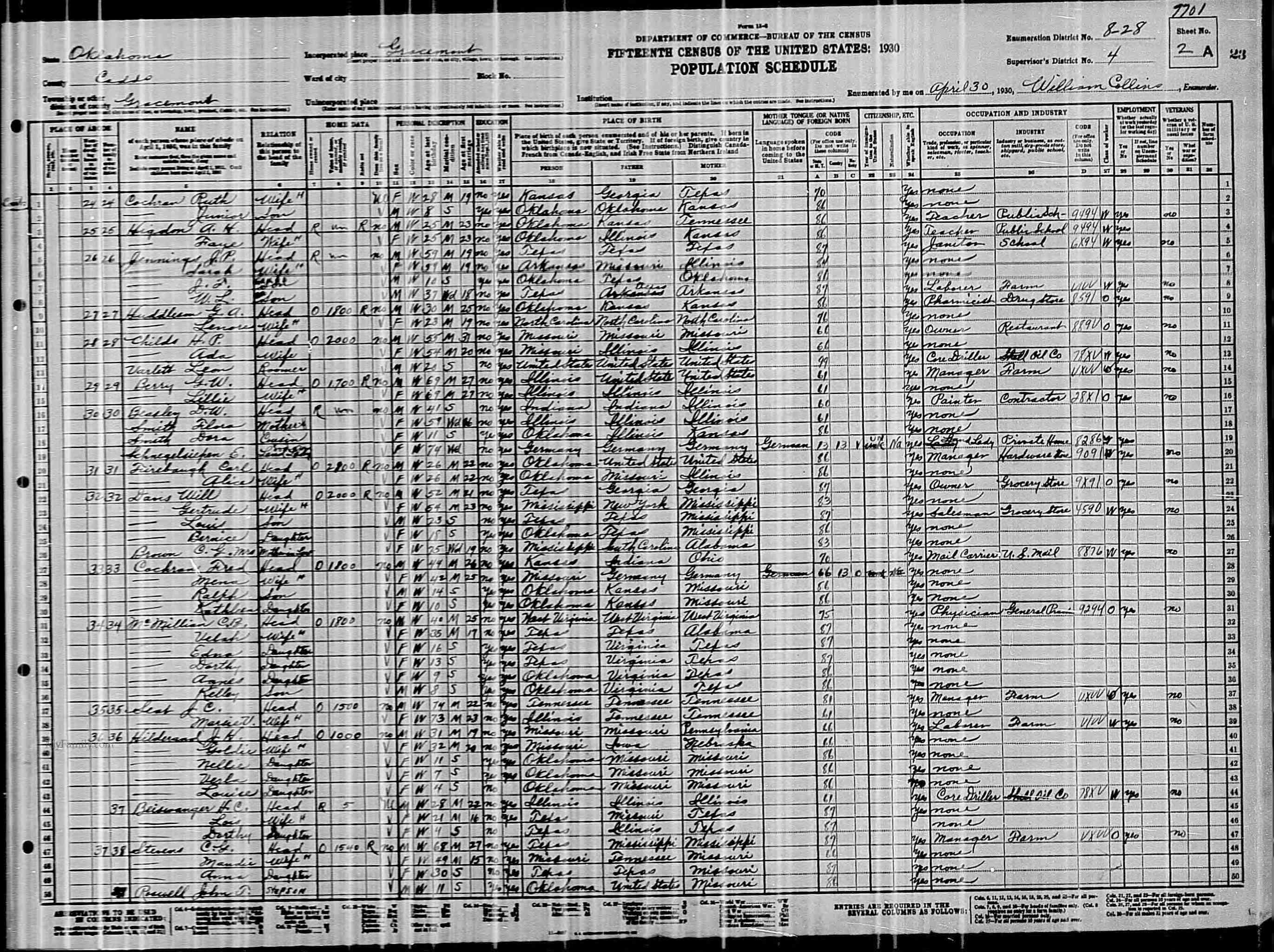 | Line | Family | Name | Relation | Sex | Color | Age | Status | Self | Father | Mother | Occupation | XR | XW |