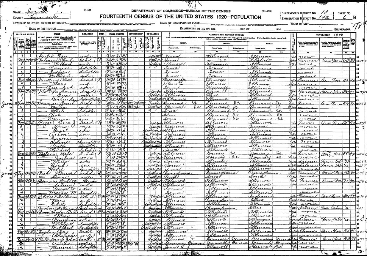 | Line | Family | Name | Relation | Sex | Color | Age | Status | Self | Father | Mother | Occupation | XR | XW |