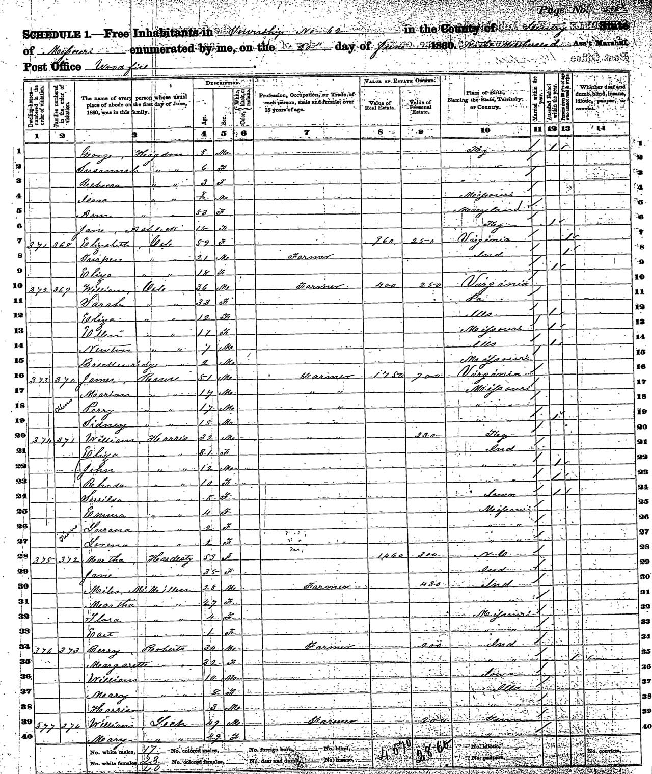 | Line | Family | Name | Age | Sex | Color | Occupation | Birthplace | XR | XW | Health |