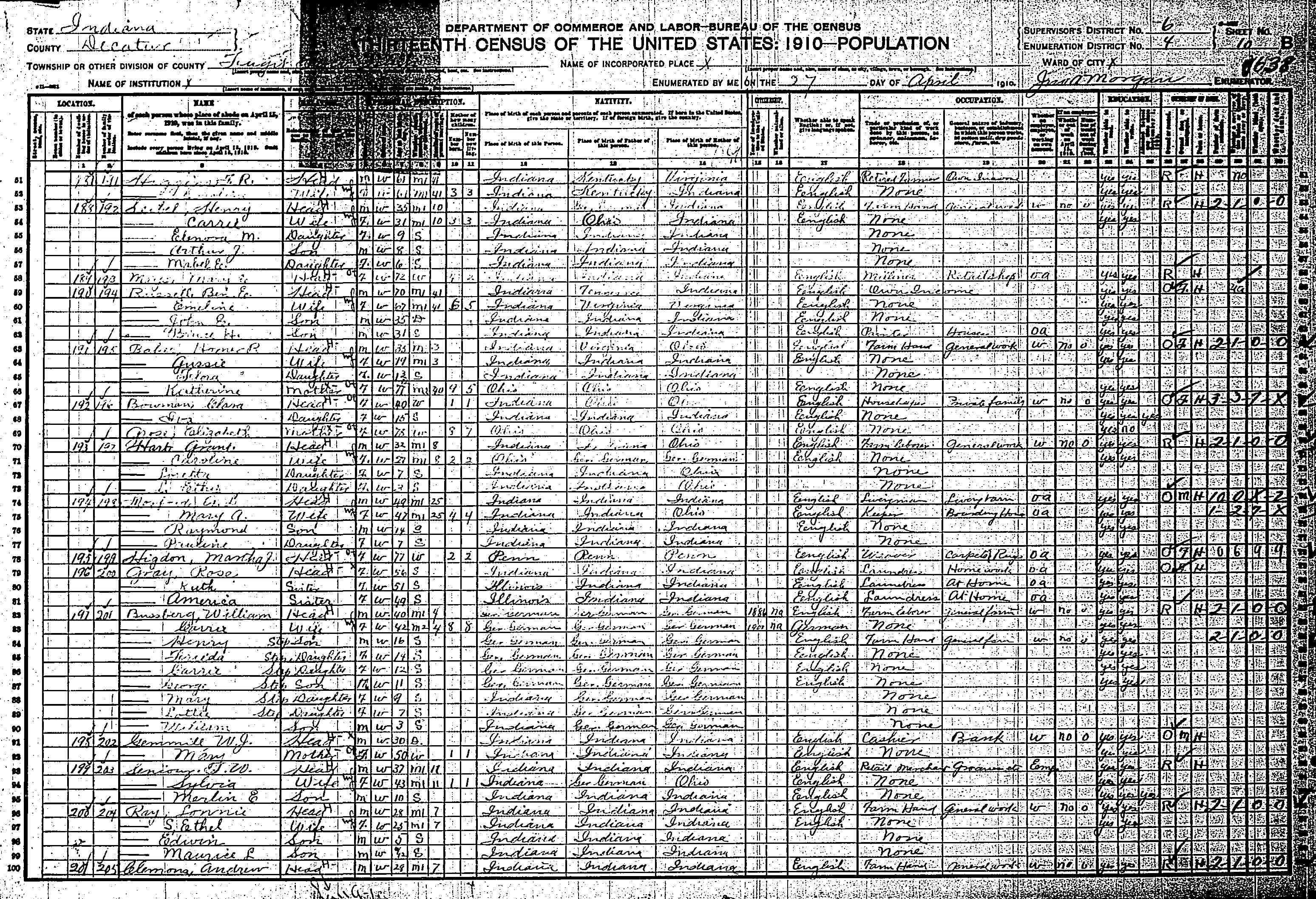 | Line | Family | Name | Relation | Sex | Color | Age | Status | Years | Total | Living | Self | Father | Mother | Occupation | XR | XW | B | D |