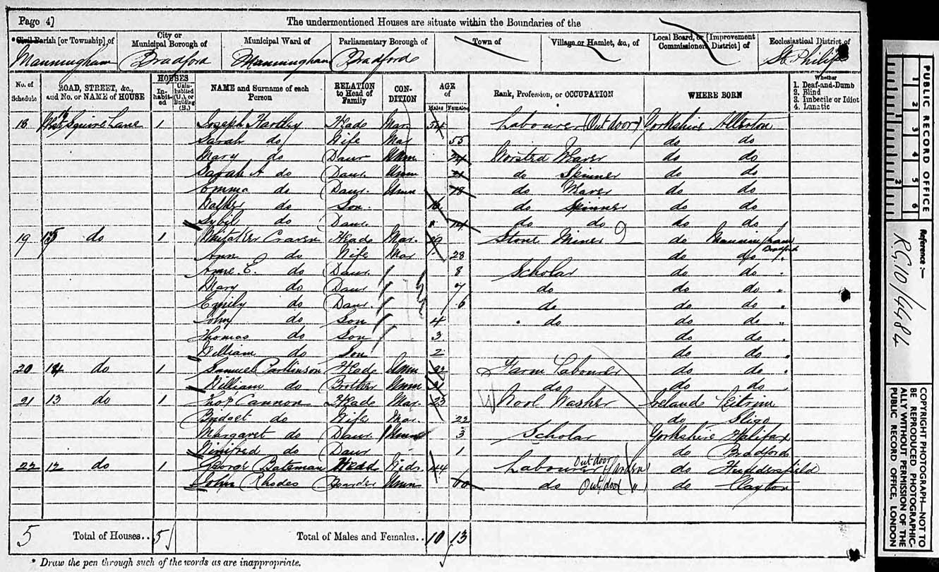 | Line | Family | Name | Relation | Color | Sex | Age | Birthplace | Occupation |