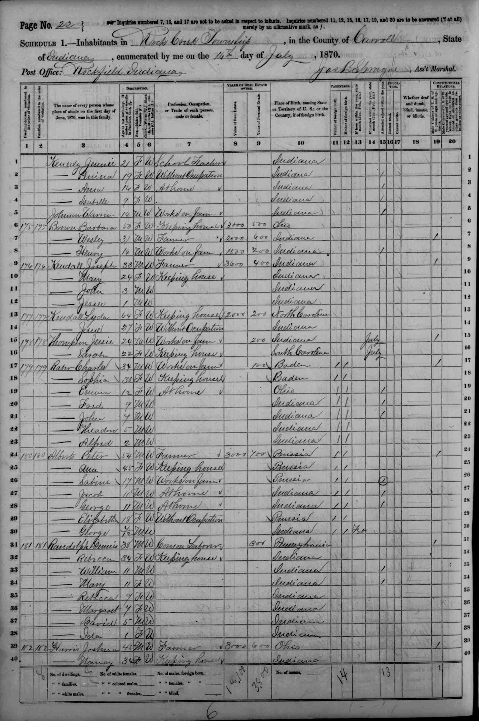 | Line | Family | Name | Age | Sex | Color | Occupation | Home Value | Personal Value | Birthplace | Father Foreign | Mother Foreign | XR | XW | B | D | I |