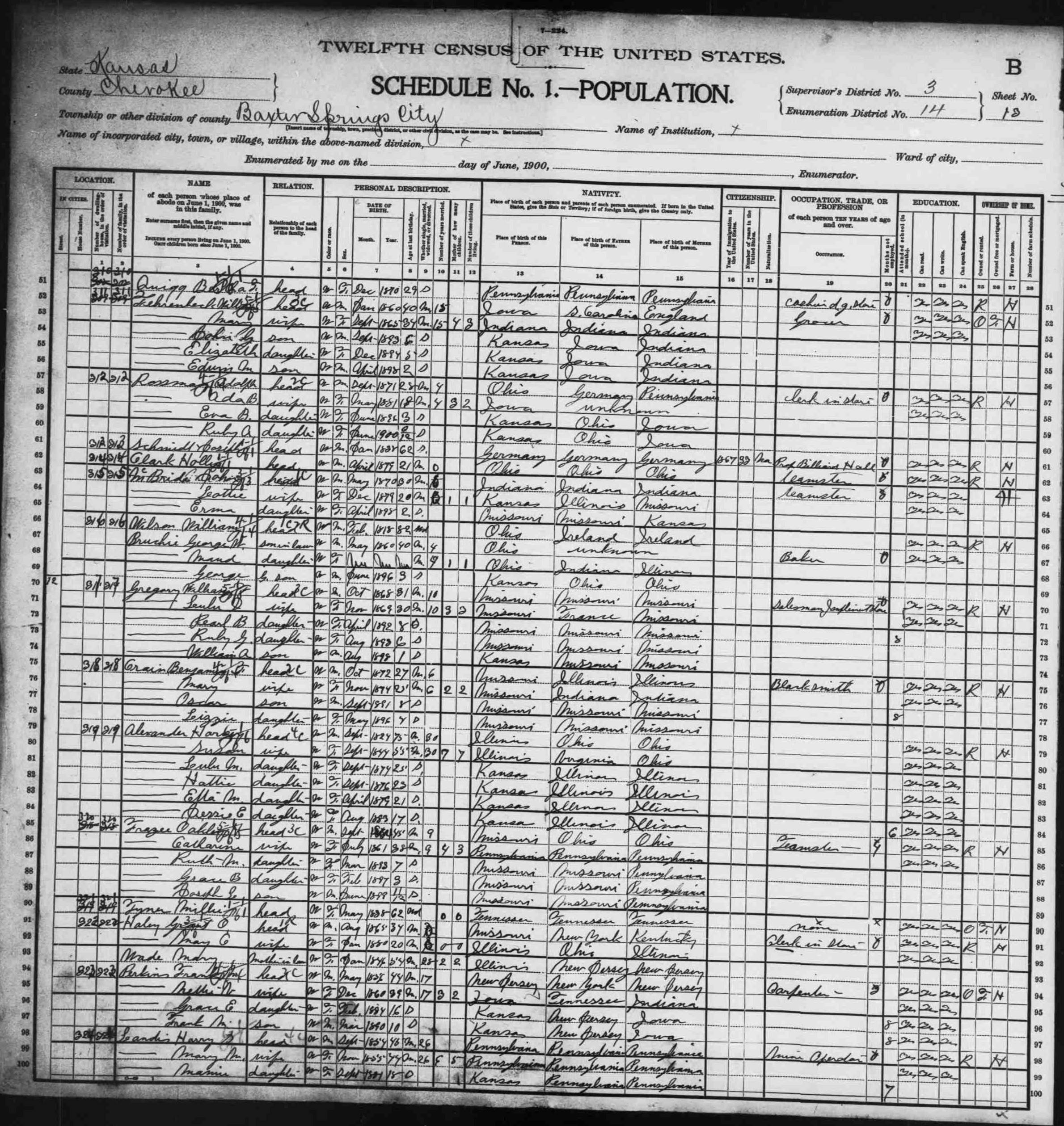 | 92 | 222 | WADE, May Cynthia | Wife | W | F | Jan | 1880 | 20 | M | 0 | 0 | IL | OH | IL | ||||