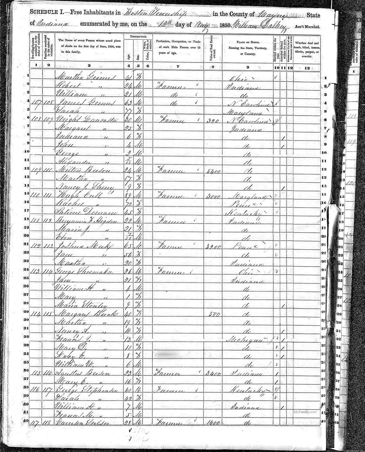 | 18 | 112 | HIGDON, Benjamin Franklin | 22 | M | W | Farmer | IN | |||||