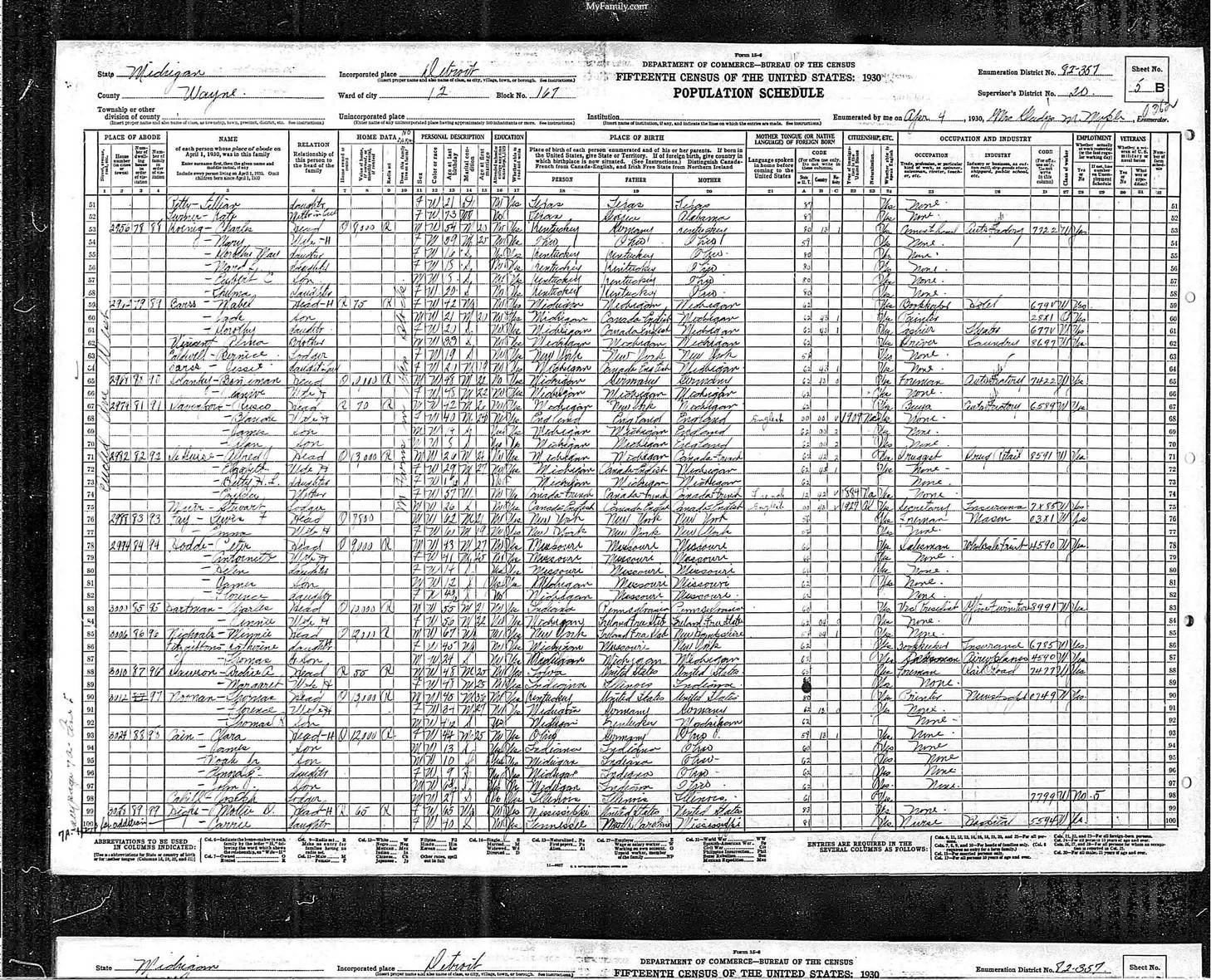 | Line | Family | Name | Relation | Sex | Color | Age | Status | Self | Father | Mother | Occupation | XR | XW |