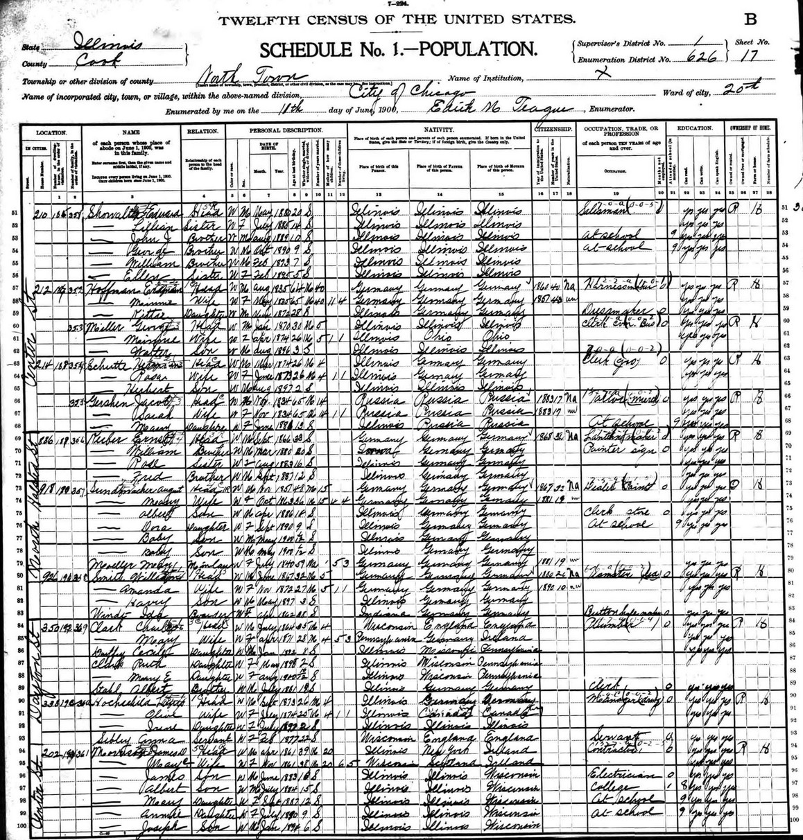 | 59 | 352 | HOFFMANN, Katharina (Kittie) 212 Center St | Daughter | W | F | May | 1872 | 28 | S | IL | Germany | Germany | Dressmaker | |||||