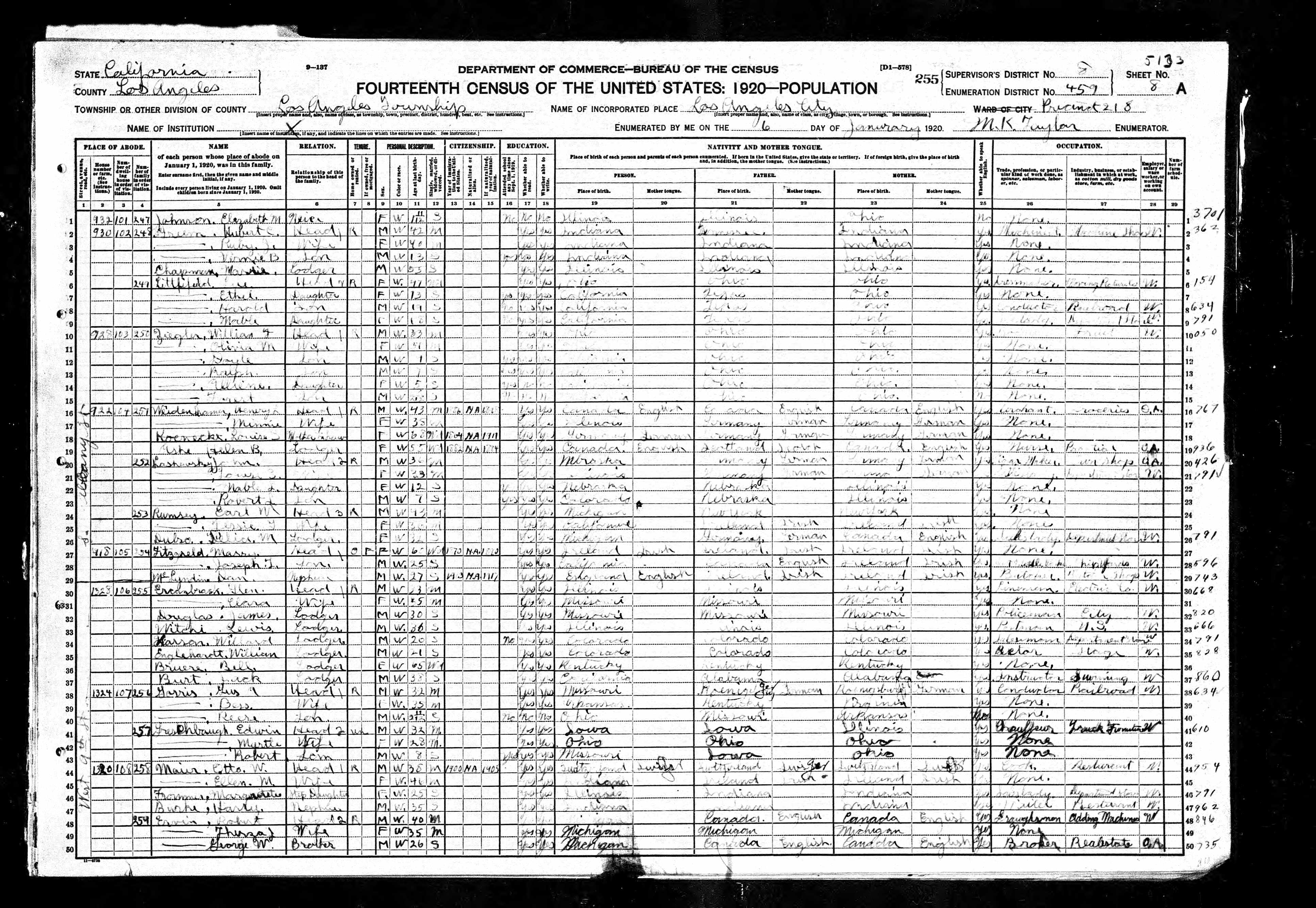 | 41 | 257 | GRESCHBAUGH, Edwin Wesley 1324 W 9th Street | Head | M | W | 32 | M | IA | IA | IL | Chauffeur | ||