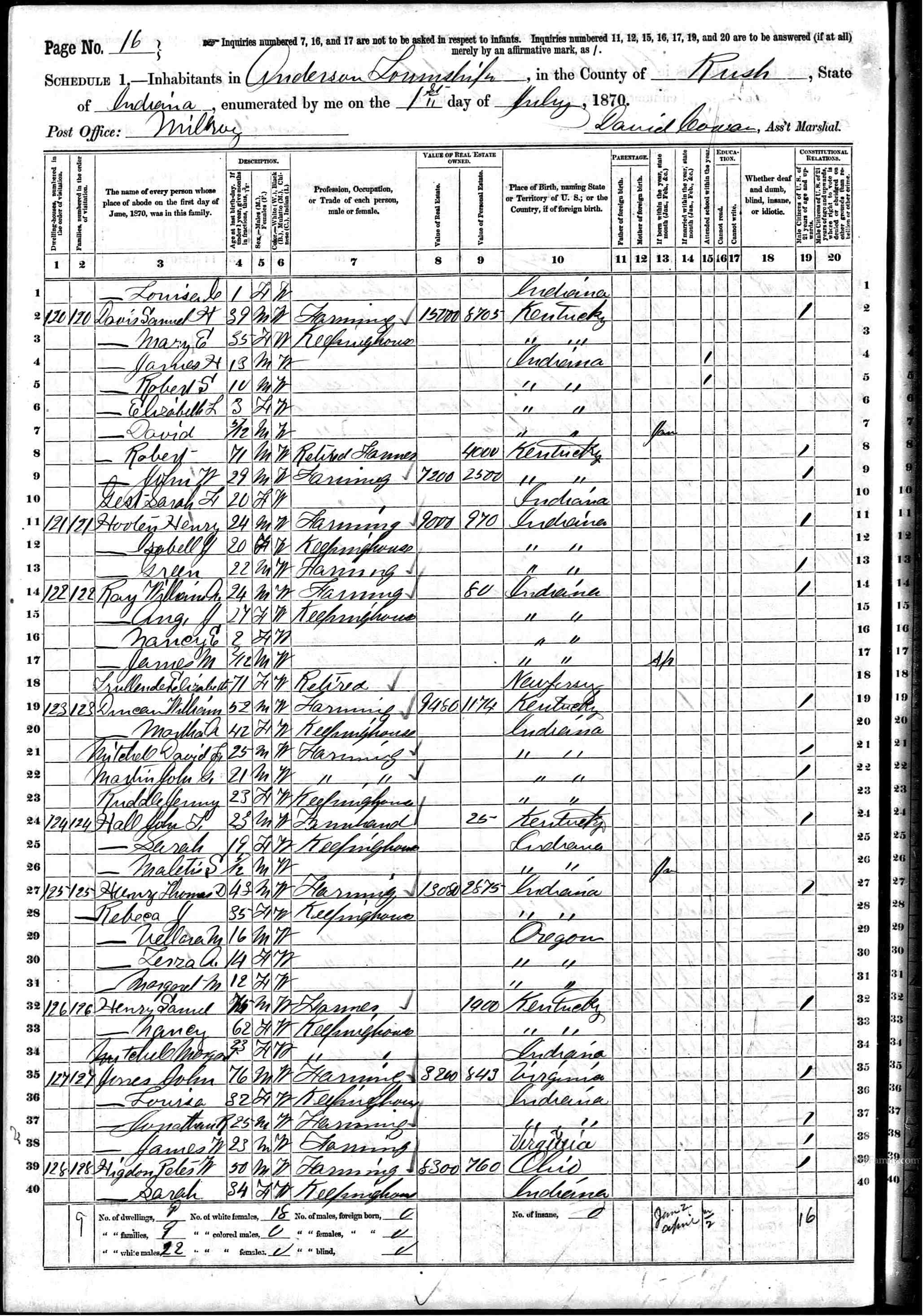 | 14 | 122 | RAY, William Amos | 24 | M | W | Farmer | 80 | IN | ||||||||