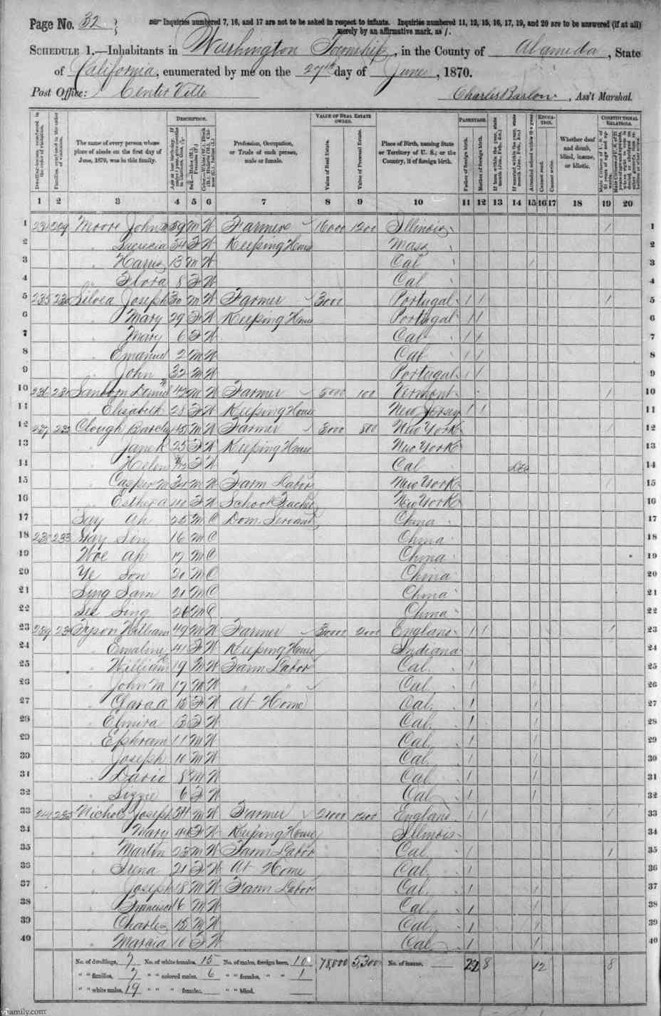 | Line | Family | Name | Age | Sex | Color | Occupation | Home Value | Personal Value | Birthplace | Father Foreign | Mother Foreign | XR | XW | B | D | I |
