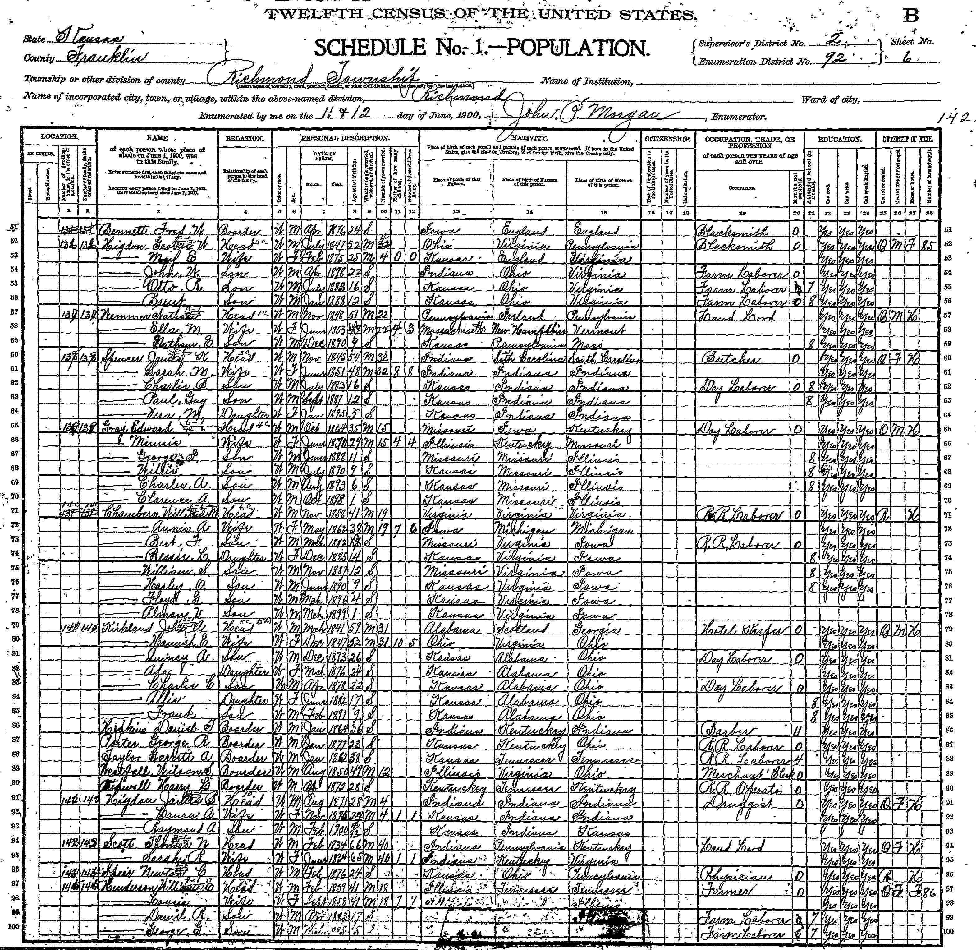 | 92 | 142 | TIPPIN, Laura A [HIGDON] | Wife | W | F | Nov | 1875 | 24 | M | 4 | 1 | 1 | KS | IN | IN | |||
