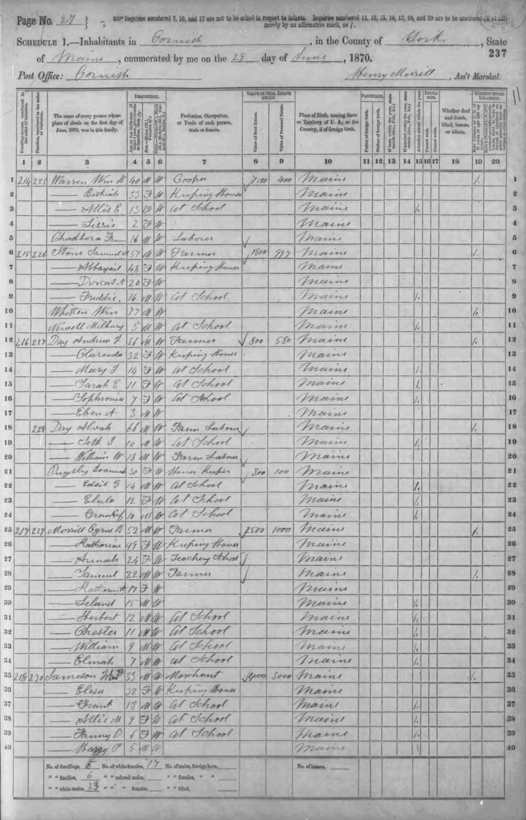 | Line | Family | Name | Age | Sex | Color | Occupation | Home Value | Personal Value | Birthplace | Father Foreign | Mother Foreign | XR | XW | B | D | I |