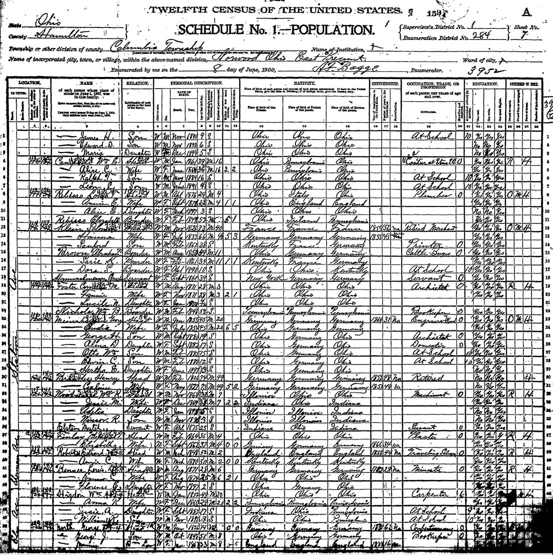 | Line | Family | Name | Relation | Color | Sex | Month | Year | Age | Status | Years | Total | Living | Self | Father | Mother | Occupation | XR | XW |