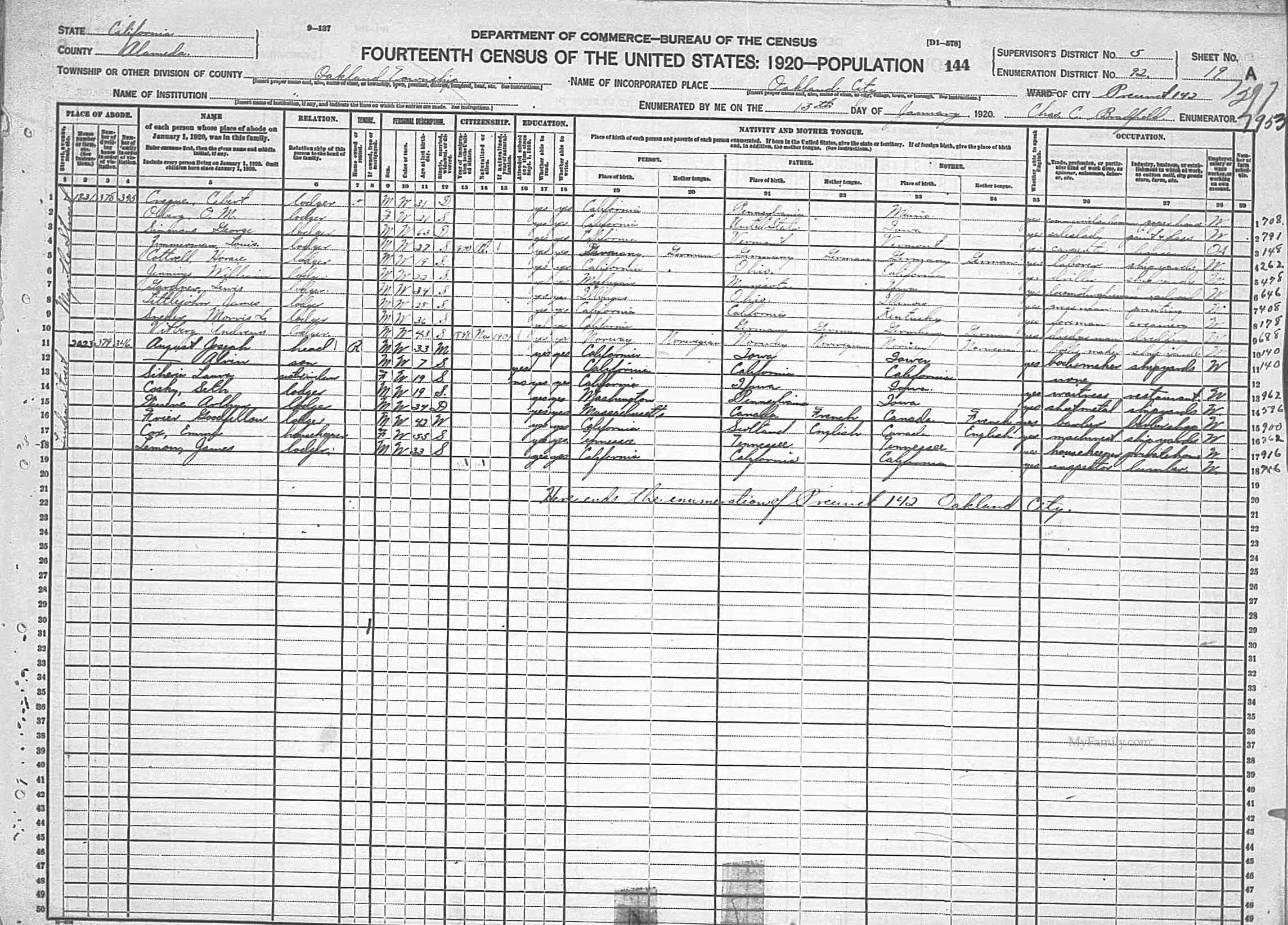 | 14 | 346 | COSKY, Seth William 2023 Linden St | Lodger | M | W | 19 | S | WA | PA | IA | Sheetmetal Shipyards | ||